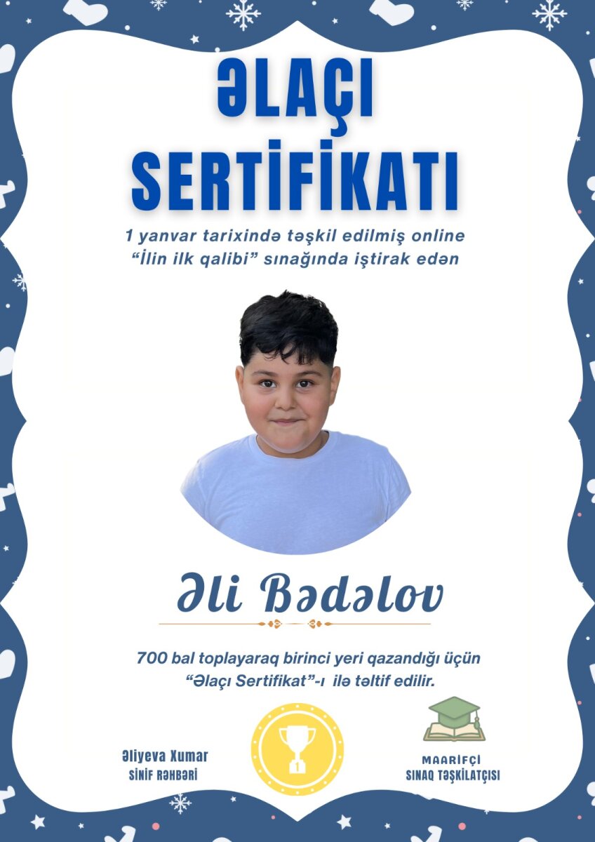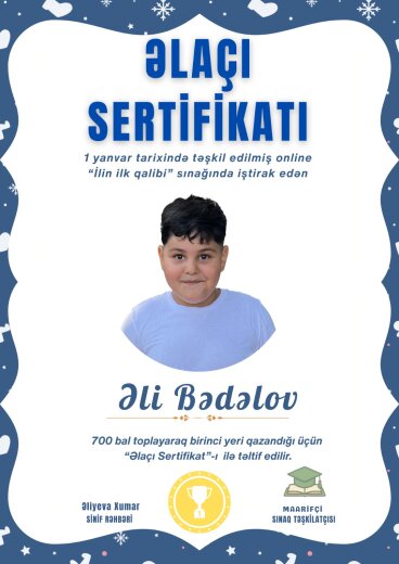 20 nömrəli məktəb liseyin 1-ci sinif şagirdi Əli Bədəlov "İlkin diaqnostik qiymətləndirmə" imtahanında yüksək nəticə göstərən şagirdlər arasındadır.