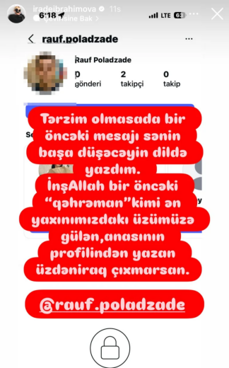 Bu barədə İradə instaqramda "story" paylaşıb.