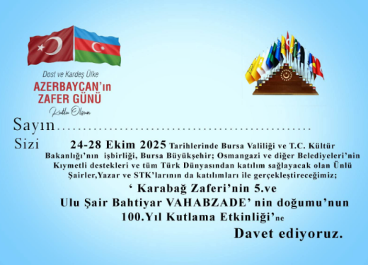P.S. Türkiyədə keçiriləcək Azərbaycan günlərinə qardaş və dost ölkədə yaşayan Hüseyn Gözəloğlundan mən də dəvətnamə almışam. Türkiyənin Bursa rəhbəri və Bələdiyyə Başqanının dəstəyi ilə təşkil olunacaq tədbirlərdə iştirak etmək arzusu ilə: