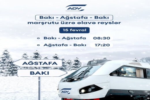 "Azərbaycan Dəmir Yolları" QSC-nin (ADY) artan sərnişin tələbatını təmin etmək məqsədilə fevralın 15-də Bakı-Ağstafa-Bakı istiqamətində əlavə qatar reysləri təyin edir.Bu barədə səhmdar cəmiyyətindən bildirilib.