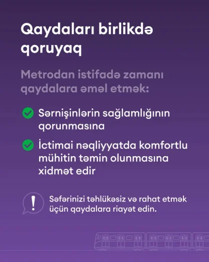 "Unutmayın ki, qaydalar hər bir sərnişinin sağlamlığı və rahatlığı üçün nəzərdə tutulub. Gəlin ictimai nəqliyyatda sağlam mühiti birlikdə qoruyaq! Daha rahat səfər üçün qaydalara riayət edək", - məlumatda qeyd edilib.