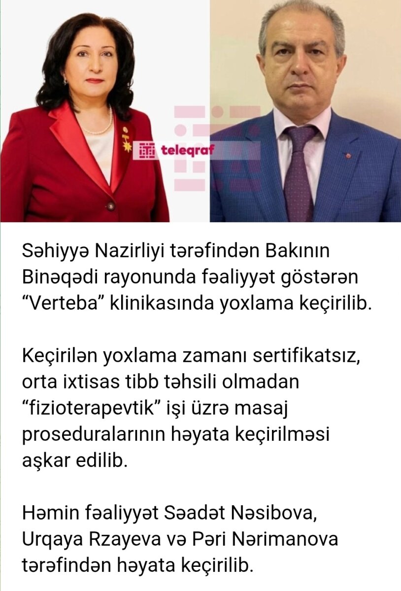 Qeyd edək ki, “Vertebra” Onurğa Tibb Mərkəzinin baş həkimi İradə Hacıyevadır. Holdinqin rəhbəri isə İlqar Əliyevdir. teleqraf.com