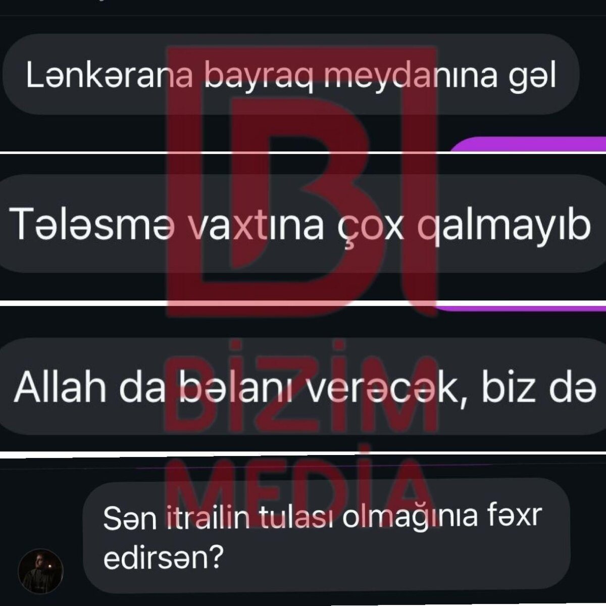 Manevr.az Bizim.Media-ya istinadən xəbər verir ki, sosial şəbəkədə Tamerlan Nəsirli adlı şəxs S. Bəkirqızına ard-arda ölüm təhdidlərinin yer aldığı mesajlar göndərib.